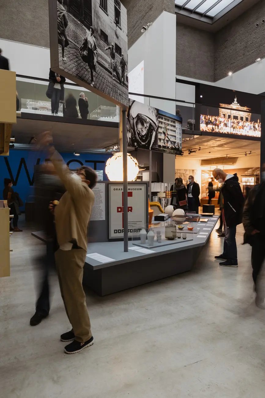 The extraordinary circumstance of having a double history brings into focus the status of design in different material and social conditions. Accordingly, the first section of the exhibition focusses on how design in both countries featured as an instrument of political propaganda and as a tool for the formation of identity. In addition, objects are presented that show a connection between the two countries. On both sides of the wall, it was seen as relevant to link into modern ideas and to engage in economic exchange. The exhibition departs from past retrospective shows and publications on “German” design which only rarely afforded East German design culture its own significance and meaning.
